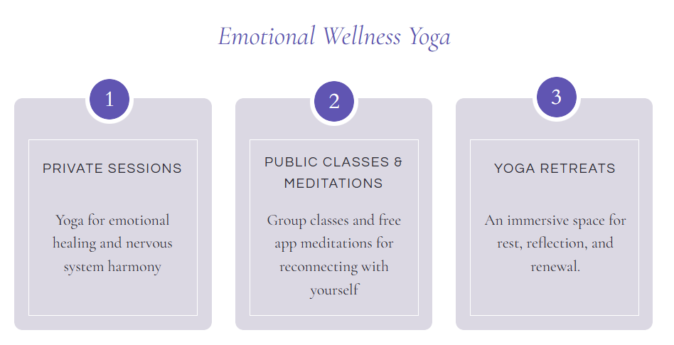 Each program brings together movement, breath, mindfulness, and emotional wellness principles to help you regulate your nervous system, deepen self-awareness, and reconnect with your steadiness. Through consistent practice, you begin to carry a greater sense of calm, clarity, and self-trust into your daily life.