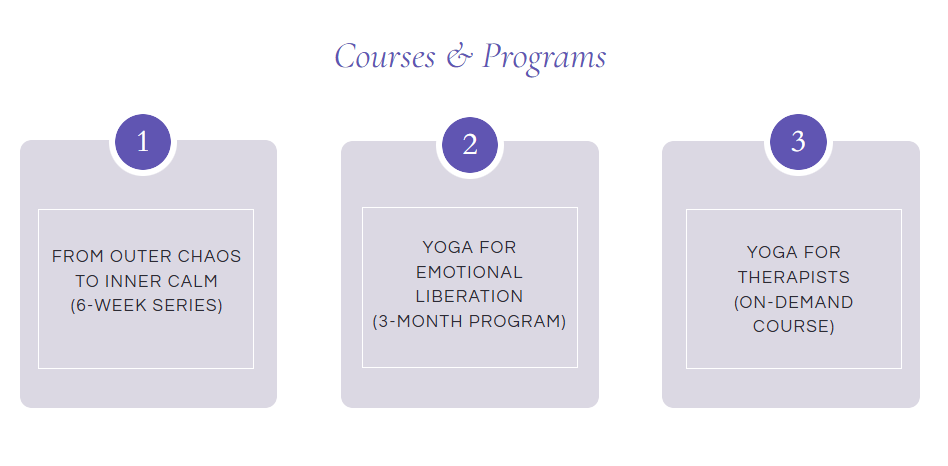 Structured experiences designed to support lasting, meaningful change. Upcoming offerings include the 6-week From Outer Chaos to Inner Calm, the 3-month Yoga for Emotional Liberation, and the on-demand Yoga for Therapists program.