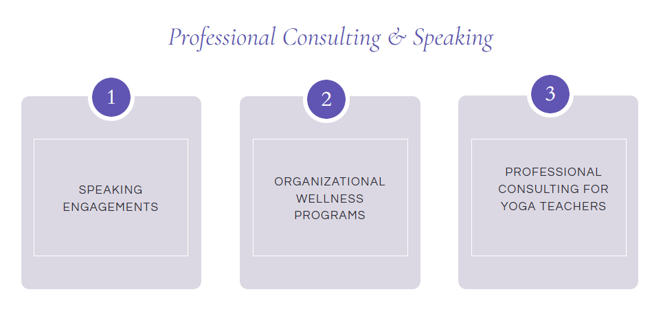 Opportunities to bring this work into professional and community spaces. I offer speaking engagements, organizational wellness programs, and consulting for yoga teachers and mental health professionals.